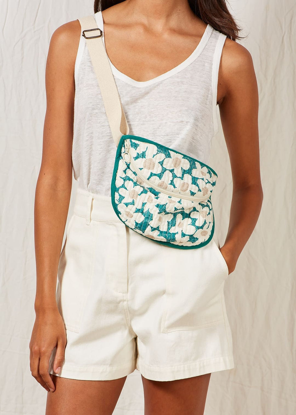 "Quilted banana bag, exclusive flowers print. Uni cotton lining. Zip on the front.