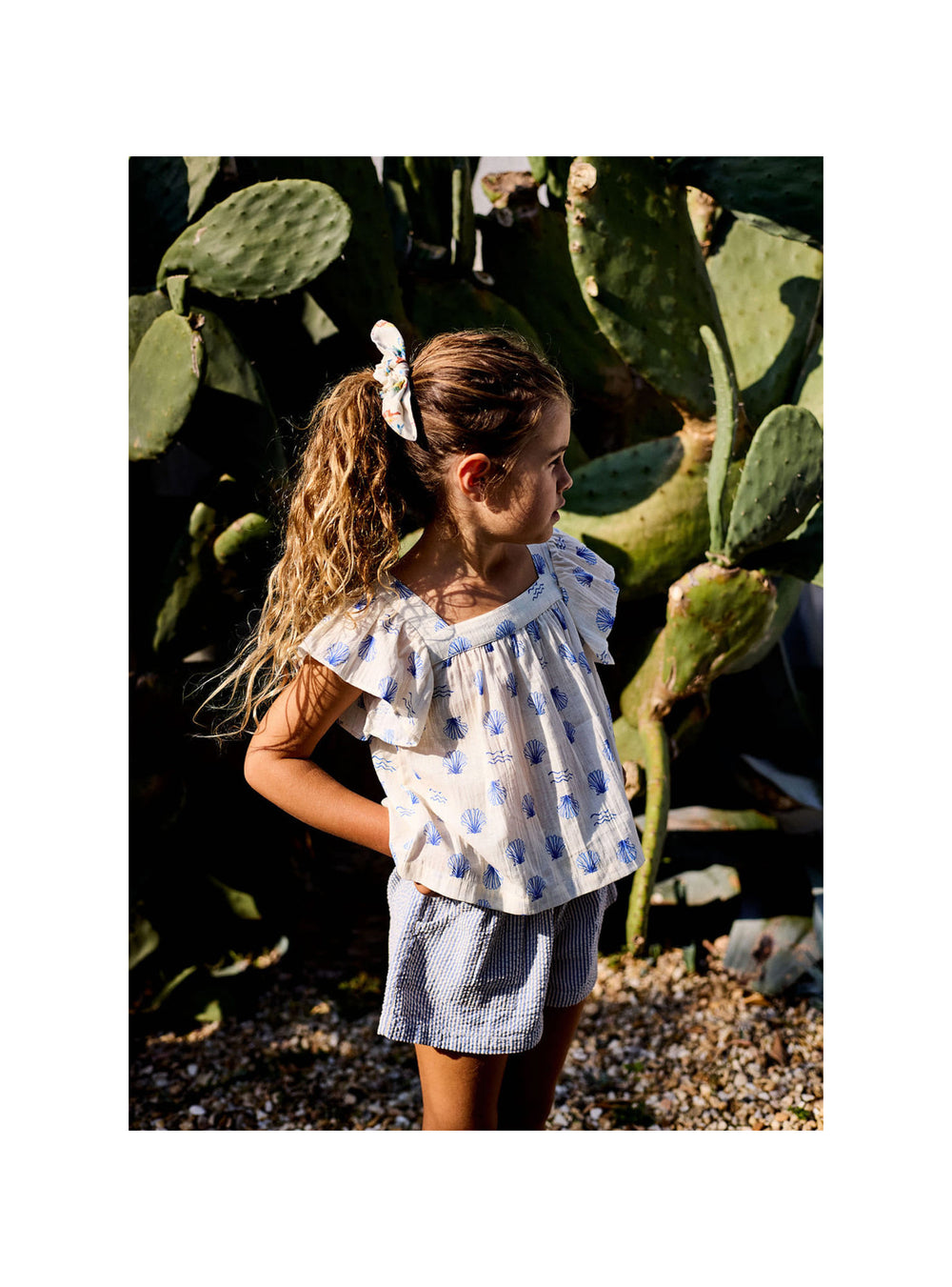 Exclusive shell-print blouse in soft cotton gauze. Features a square neckline with delicate gathers at the front and back. Wide ruffled sleeves add a charming, airy touch.