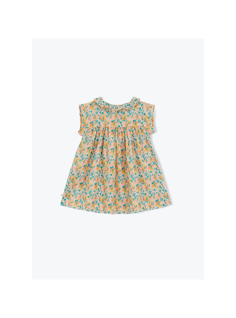 Delicate and charming, this baby dress features an exclusive ecru floral print on soft cotton voile. Designed with a ruffled collar, short sleeves, and front button fastening, it offers both elegance and comfort. Gentle gathers at the front and back add a graceful touch, making it perfect for any special occasion or everyday wear.