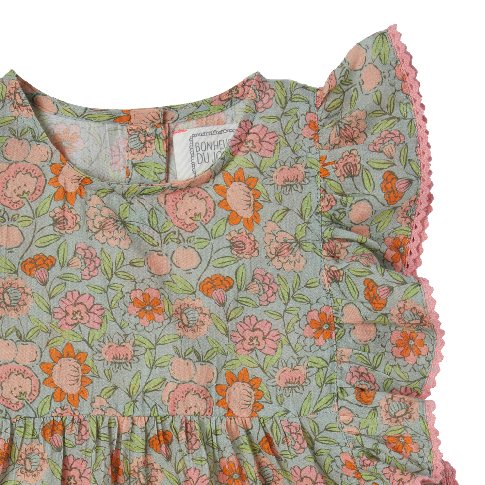 Blouse girl's green with pink and blue flowers on the background. Front yoke trimmed with gathers and a pink colored tie and pompoms and the end of the sleeves are tightened by an elastic.