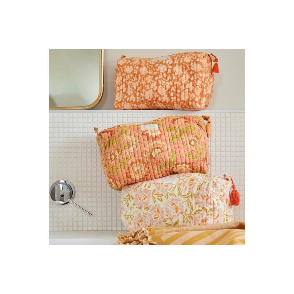 Toilet bag with print flowers. Opening with zipper. Hand made pompons at edge of zipper and  vertical stitches quilting.