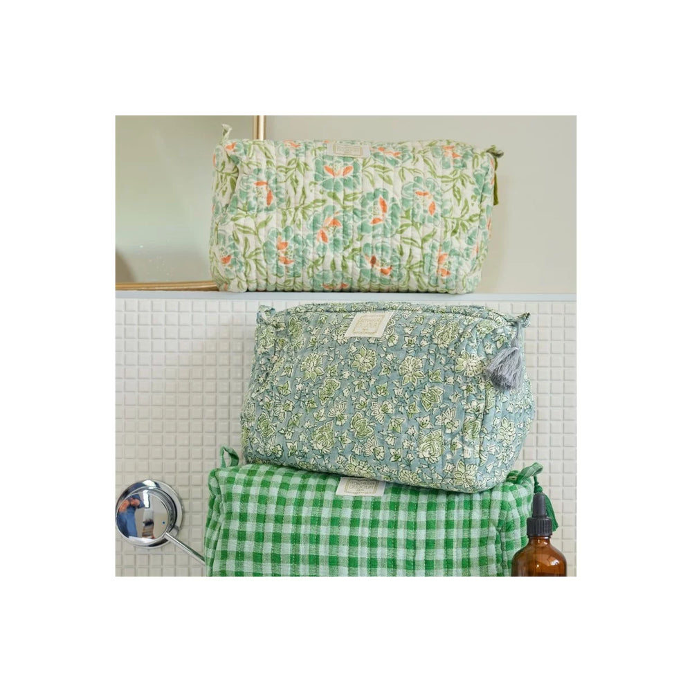 Toilet bag with print flowers. Opening with zipper. Hand made pompons at edge of zipper and  vertical stitches quilting.