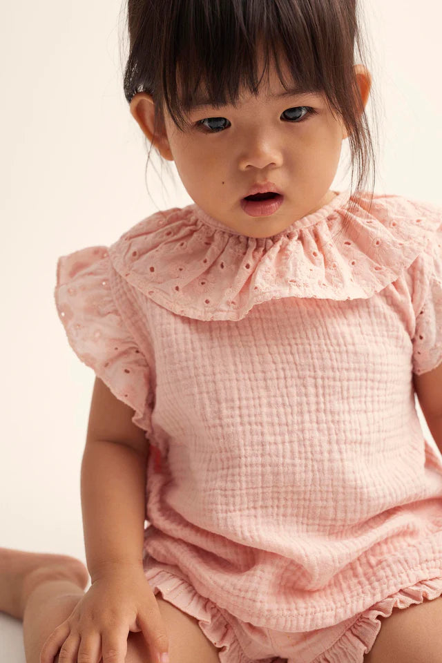 Elevate your little one’s wardrobe with our enchanting Gauze Baby Top! Crafted from the softest, fluffy cotton gauze, this delightful baby blouse is perfect for twirling and playtime. The charming round neckline and button teardrop closure at the back make dressing a breeze, while flutter sleeves adorned with delicate Swiss embroidery add a touch of whimsy.