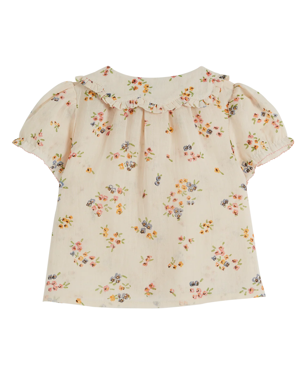 Blouse in ecru cotton sail dotted with blue flowers that red dots highlight. Stylists have blue hand at Emile and Ida. Elastic balloon sleeves, natural mother-of-pearl buttons, gathered around the neck, English seams that strengthen the solidity of the assembly and ensure the sustainability of the room for the following children. Then come the details that make this blouse unique. The bottom sleeves are hemmed in picot stitch, the first two buttons are sewn in crow's feet like flower embroidery and the flat collar is scalloped like petals and finished with a narrow flounce. A little wonder to wear every day to be a flower among flowers.