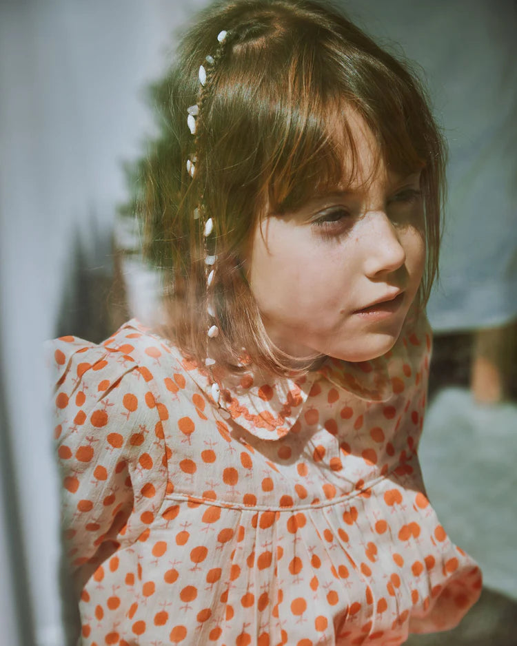 Balloon-sleeved blouse in off-white with orange mandarins in block print. To adorn the finesse and transparency of the material the blouse is completely doubled. The encroachments highlighted by the piping support the flat folds which give the magnitude to this blouse, thus not forcing any movement. The flat neck is underlined by an orange croquet braid. The opening on the entire height of the blouse closes with natural mother-of-pearl buttons in the back. Here is a blouse as toned as the mandarins. Need vitamins?
