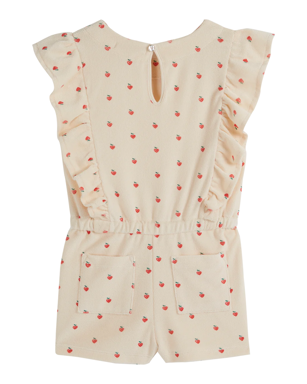 Combishort in ecru terry cloth, with little red hearts printed all-over. The designers oscillated between the power of love and the power of flowers, and they didn't make a choice: we printed flower hearts. To make this piece, we selected a cotton/polyester blend that's soft, plush, stretchy and comfortable, as the babies and girls who've tried it tell us. It has two patch pockets on the buttocks and an elasticated waistband, ruffles all along the bodice and a drop opening in the back with a natural mother-of-pearl button that slides into a strap. A combishort to be worn without moderation as soon as the first fine days arrive.