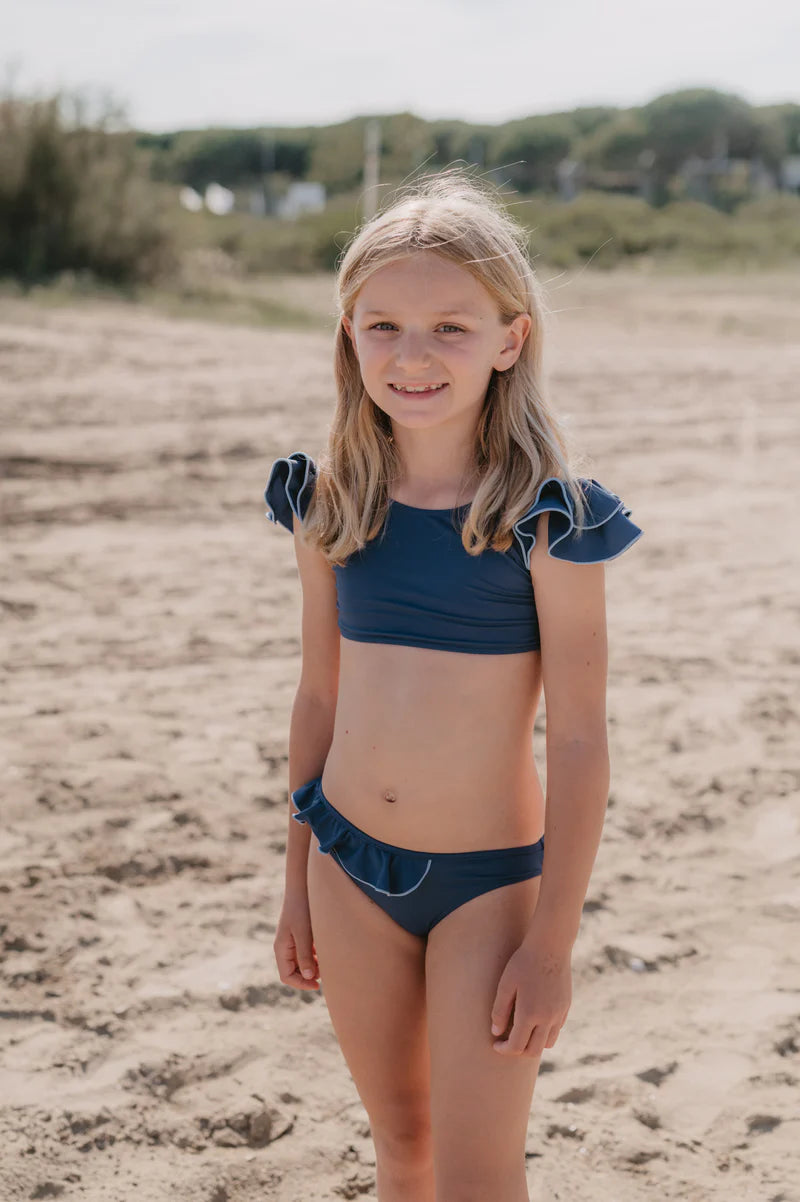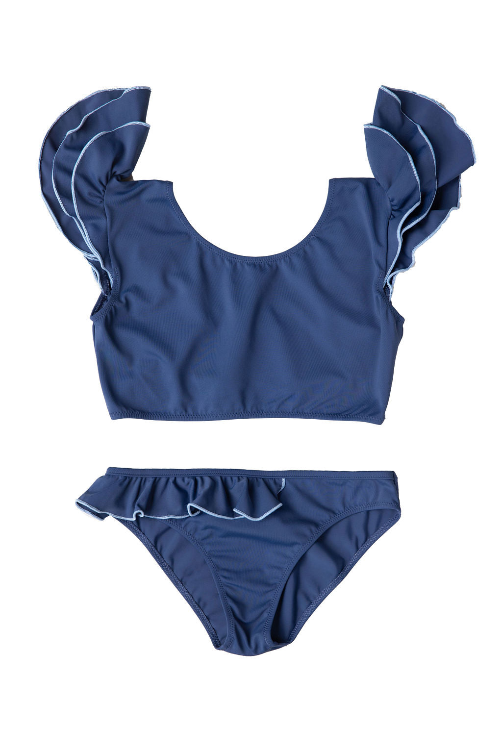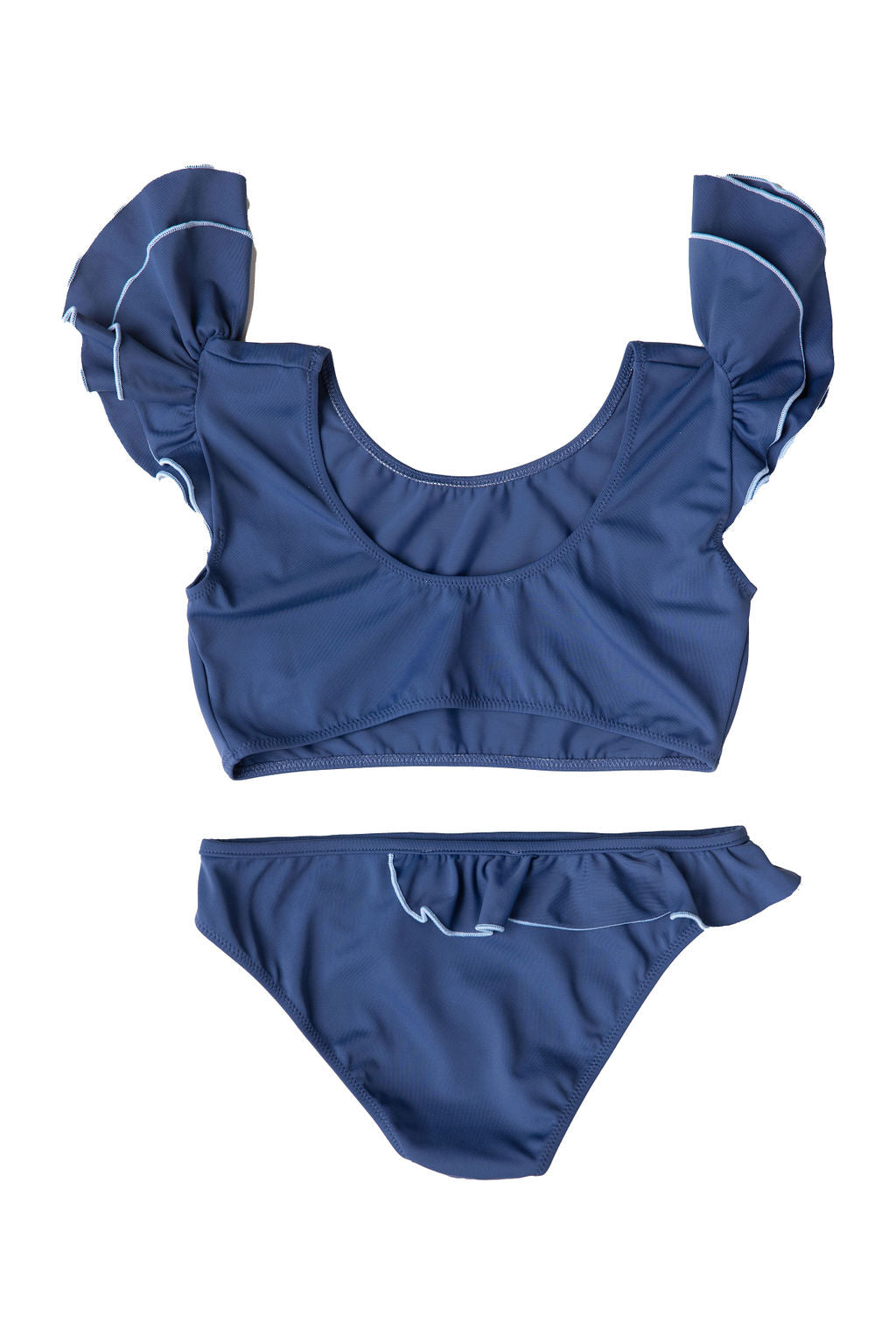 Girl's bikini blue with ruffles on the shoulders. Excellent sun protection upf 50+. Ultra chlorine resistant, resistant to suntan creams and oils and ultra thin fabric which allows quick drying and is naturally breathable.