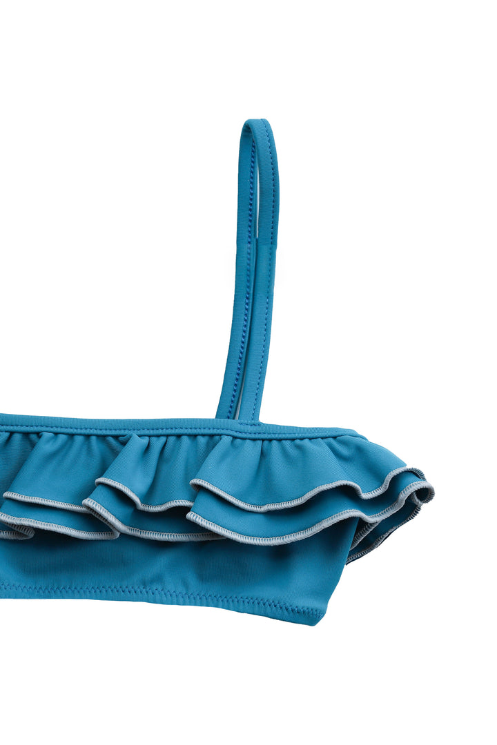 Girl's bikini sky blue with straps and ruffles. Excellent sun protection upf 50+. Ultra chlorine resistant, resistant to suntan creams and oils and ultra thin fabric which allows quick drying and is naturally breathable.