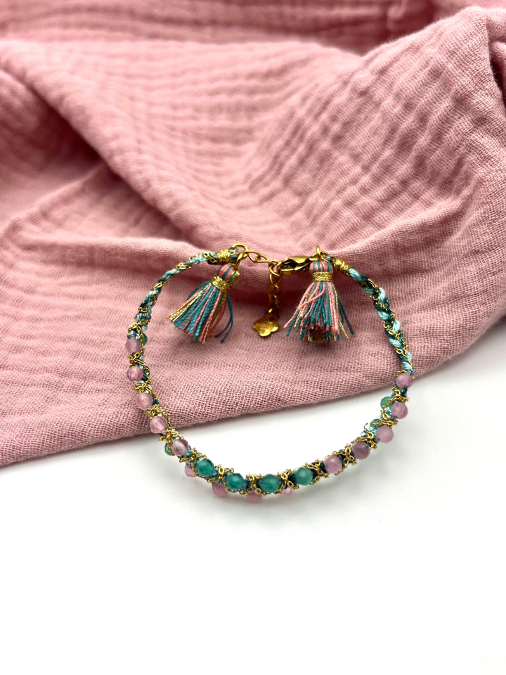 The Natsu bracelet features a delicate design with gold-plated steel and stunning tourmaline beads. Perfect for adding a touch of elegance to any outfit.