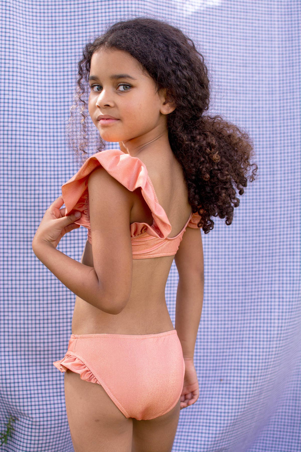 Eco-sustainable lycra bikini with ruffle detail on the shoulders. Plunging neckline on the back. Fast dry.