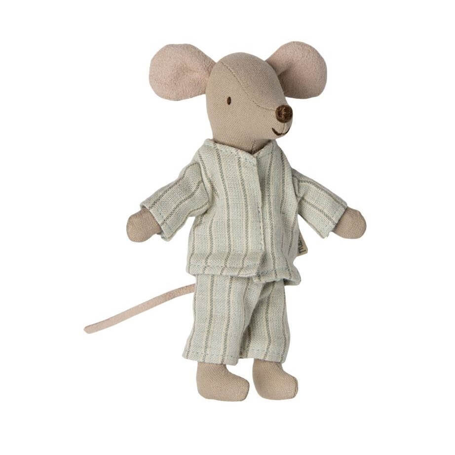 This sweet mouse has a long thin leather mouse tail,  stitched features and is wearing stripy blue pyjamas.  He has his own little bed in a matchbox with a comfortable padded mattress, patterned padded pillow and a blue and white checked blanket to keep him nice and warm.  Magnets in his paws means he can hold on to lots of wonderful Maileg accessories.