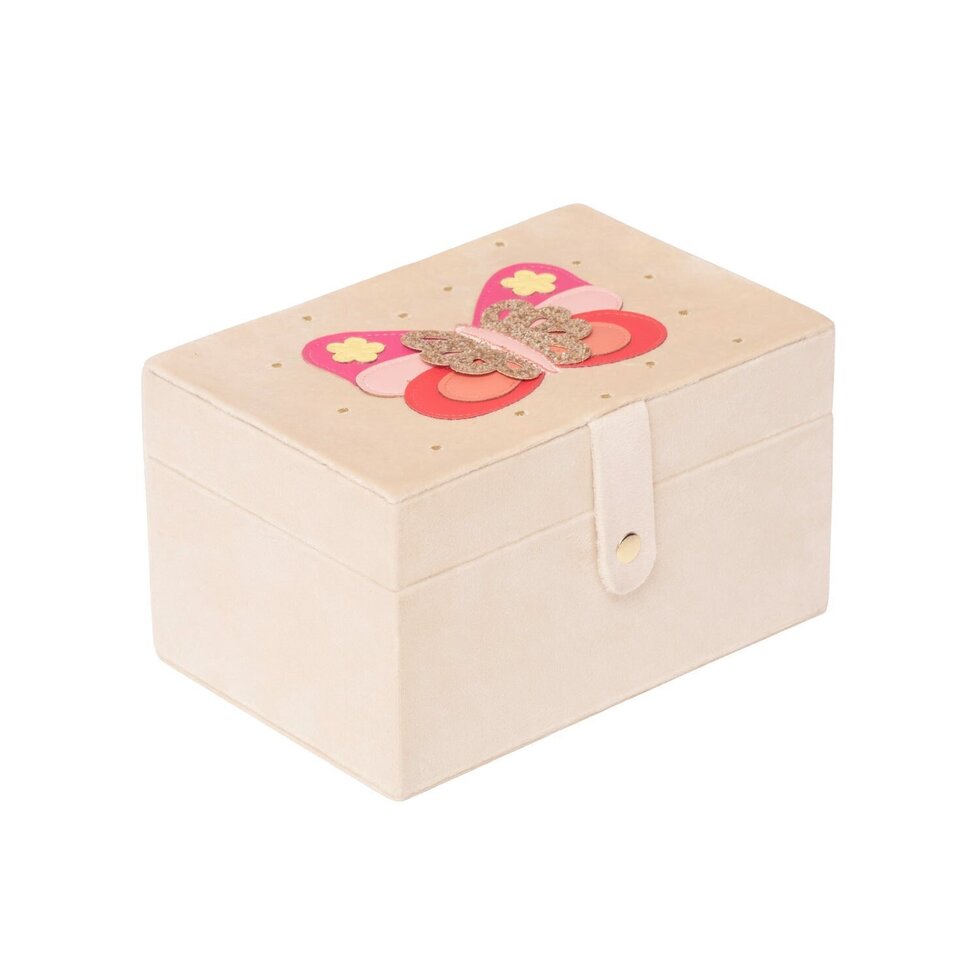 Featuring an our beautiful butterfly in vibrant PU and gorgeous glitter on top. This jewellery box has a popper fastening to reveal a large compartment, with a removable tray, a slip pocket and a dedicated space to slot earrings and rings.