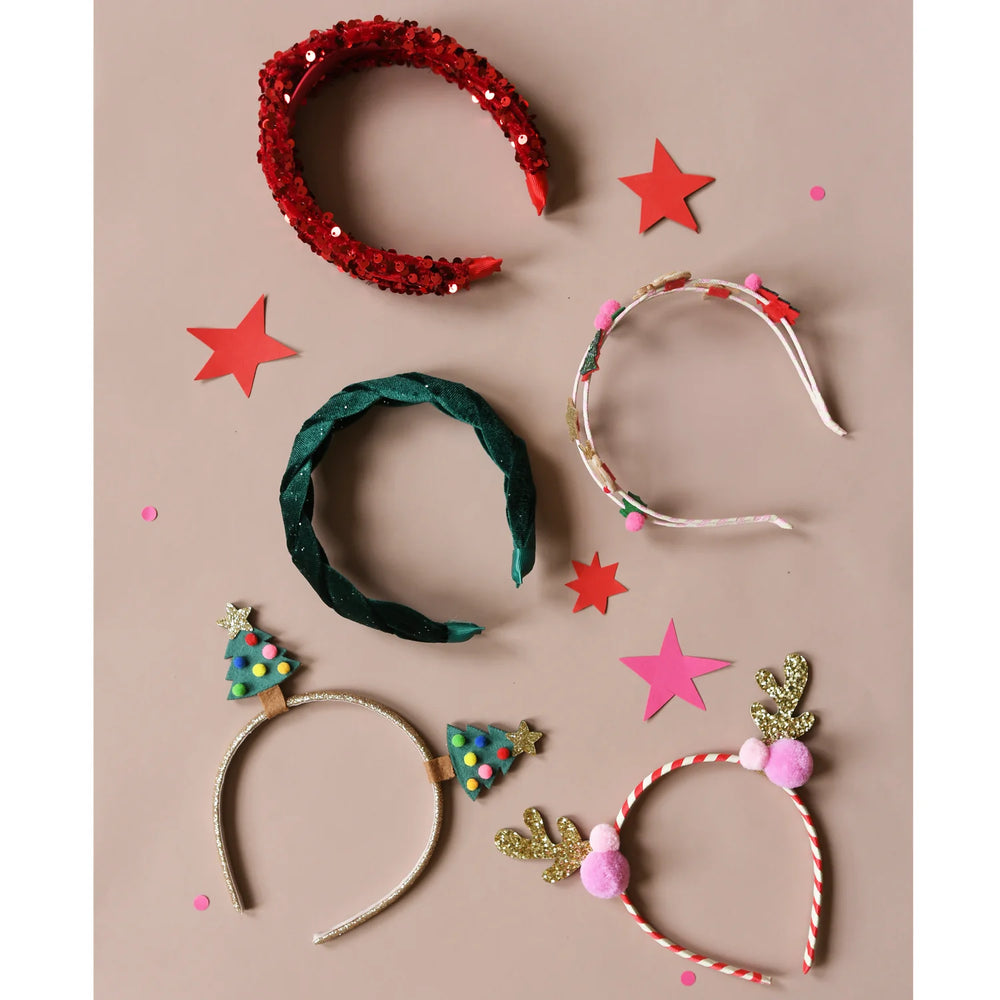 Our gorgeous evergreen velvet headband features a twisted plait detail and is scattered with delicate shimmer! Made from the softest green velvet fabric, with grosgrain ribbon wrapped ends to ensure a comfortable fit for little heads.