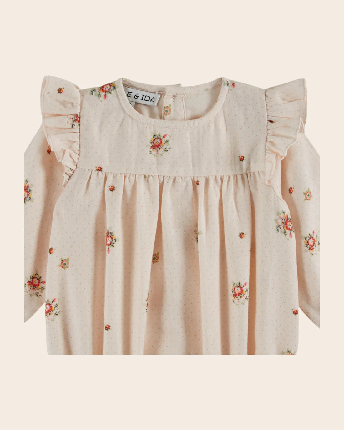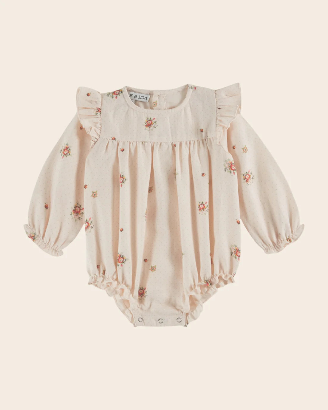Made from soft cotton flannel printed with delicate multicoloured floral bouquets on a pale pink background. Features a front yoke with gentle gathers, ruffled armholes, and long sleeves with elasticated ruffled cuffs. Elasticated legs and snap fastenings at the crotch ensure comfort, while the button opening at the back adds a refined touch.