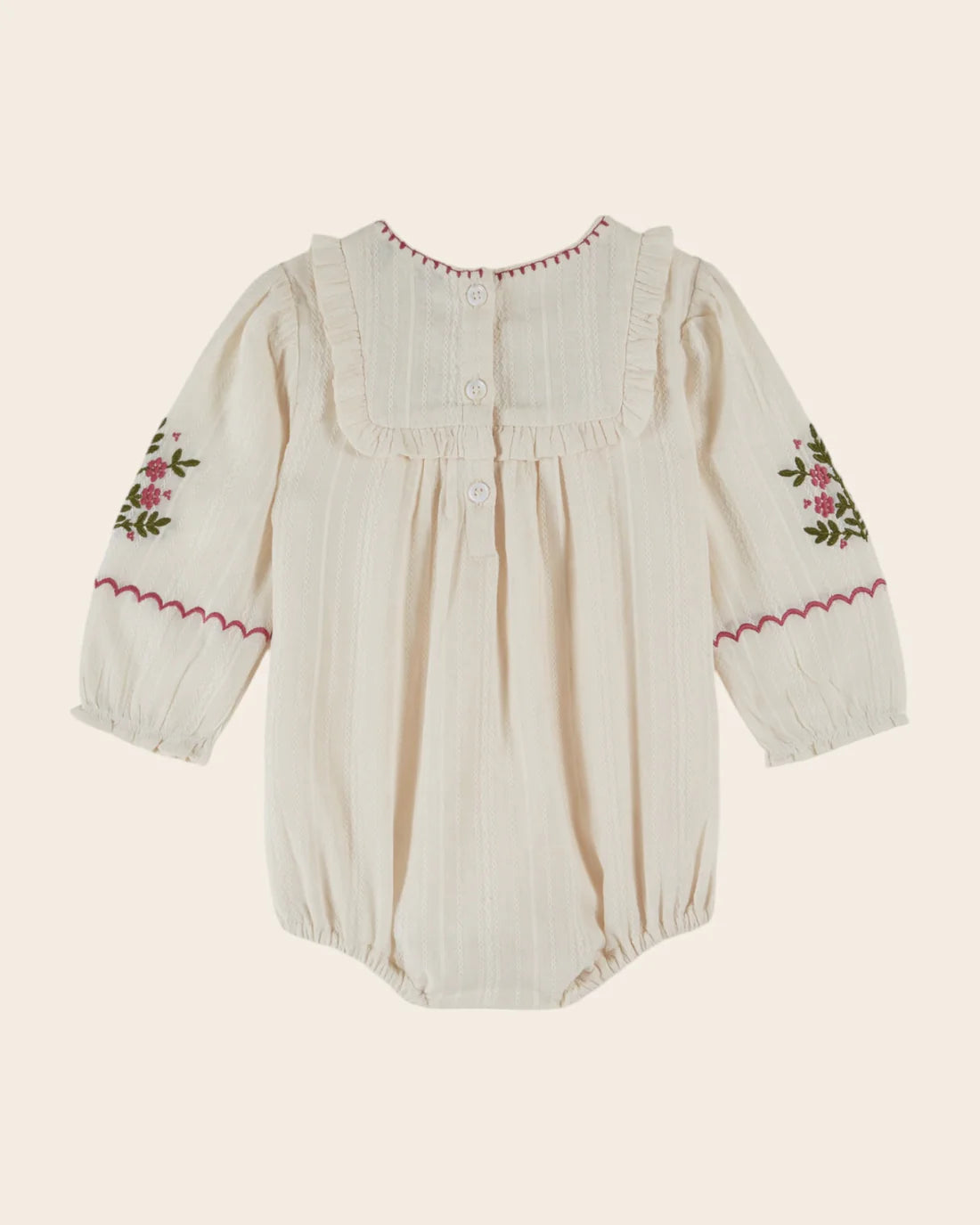 oft textured cotton combibloomer with ruffled front embroidered with fuchsia flowers and floral sprigs. Features elasticated ruffled cuffs and legs, snap crotch and mother-of-pearl buttons at the back. Fully lined in lightweight cotton voile for extra comfort.