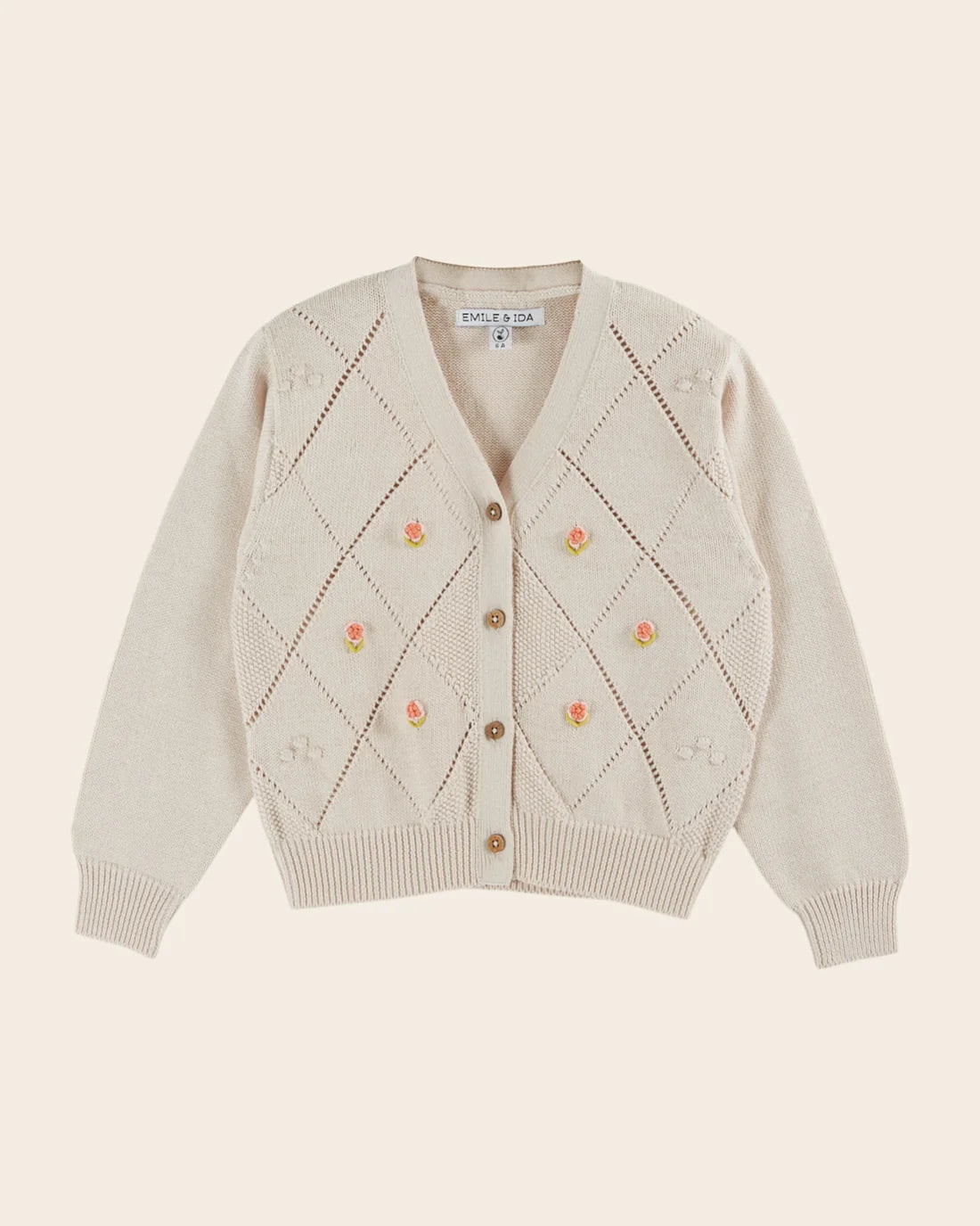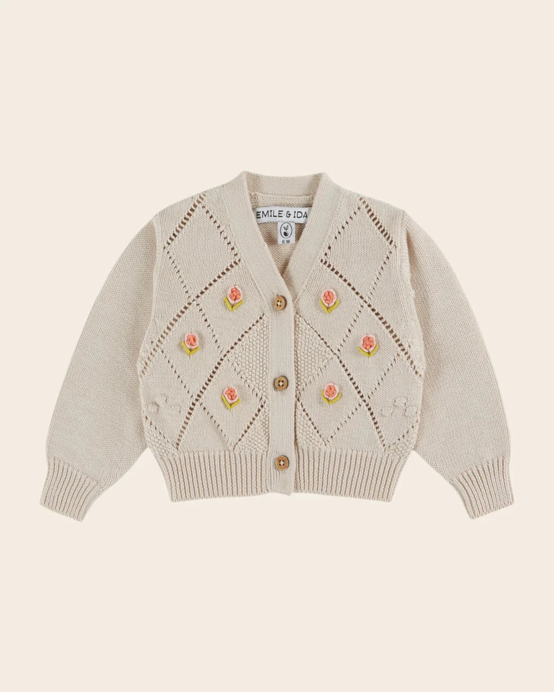 Long-sleeved ecru cardigan crafted from soft organic cotton. Features delicate hand-embroidered roses, a V-neckline and wooden buttons along the front. A beautifully handcrafted piece full of charm and elegance.
