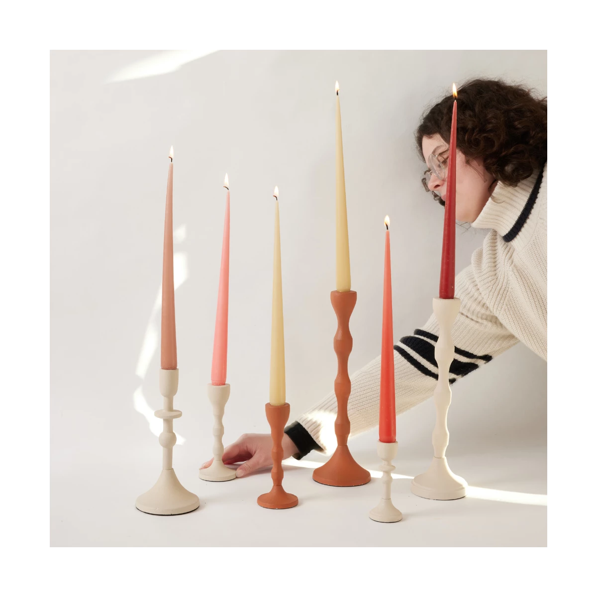 Multicolored metal candle holders. The charming Solar candle holders combine a simple shape with a bold, fashion-inspired color palette. They can be displayed alone or mixed with other pieces from the collection, playing with vibrant tones and varied heights for a dynamic and stylish effect.
