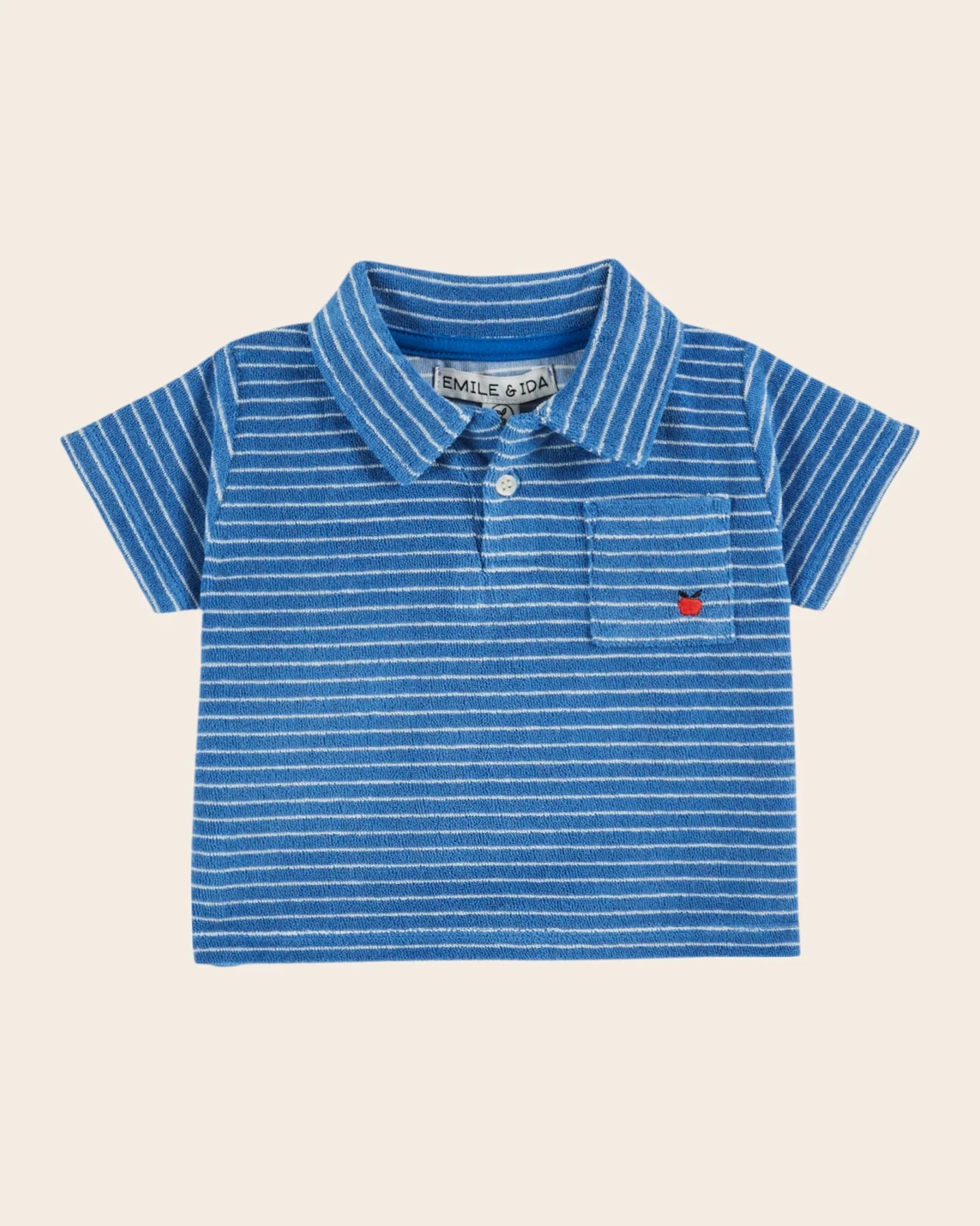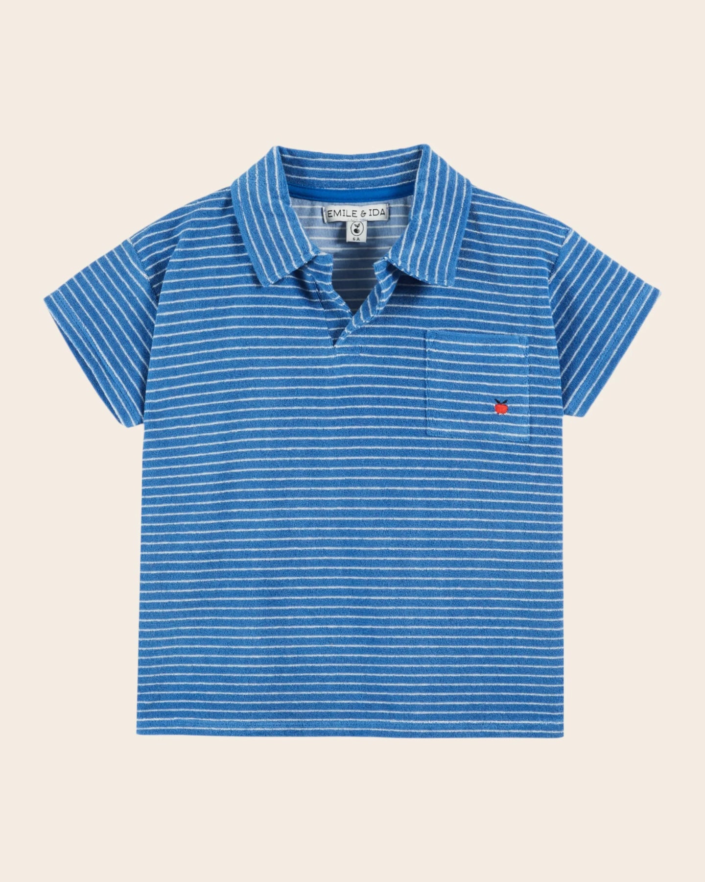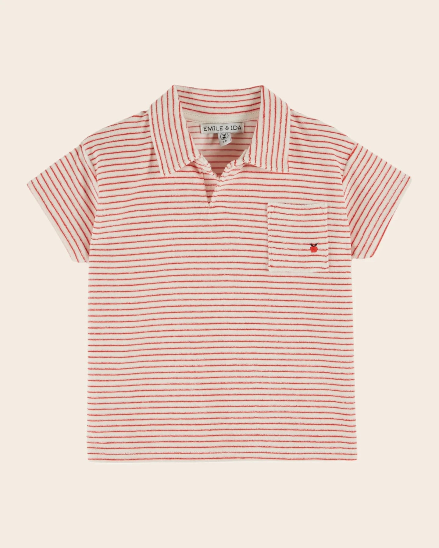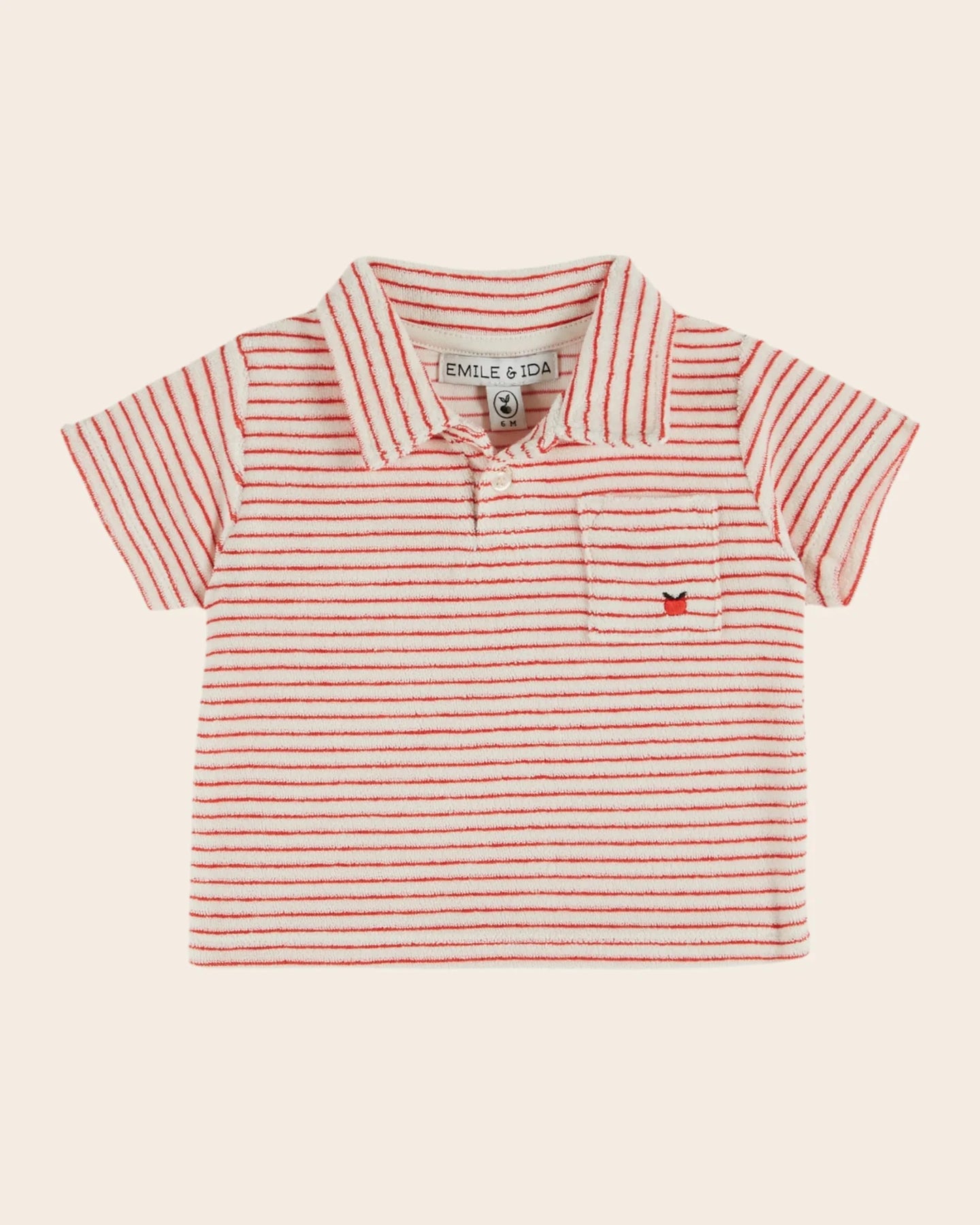 This striped terry polo shirt from Émile et Ida blends playful pattern with cozy everyday comfort. Crafted from soft, breathable cotton terry, it features horizontal coquelicot stripes and a classic polo collar for a timeless, casual look. Lightweight yet durable, this polo is perfect for warm days, playtime, or pairing with shorts and lightweight pants for relaxed seasonal outfits.