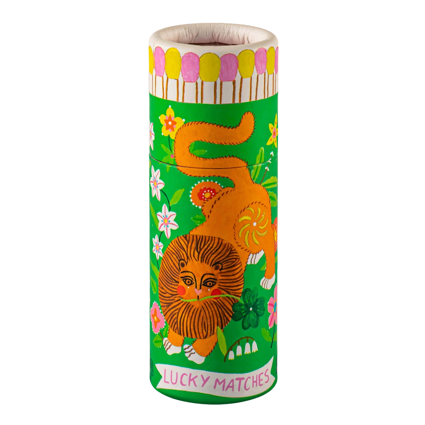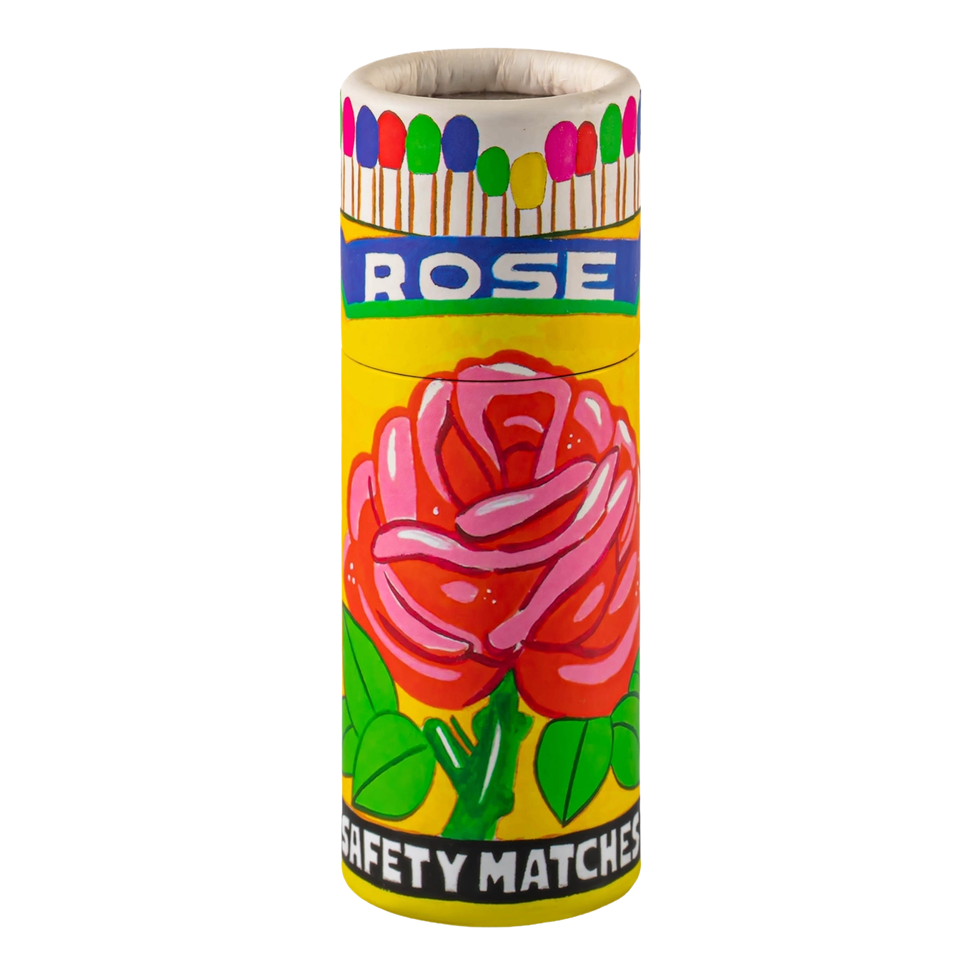 This small cylinder of matches features a vivid red rose on a bright yellow background. Playful and nostalgic, it holds 45 matchsticks ready to spark a little joy. Simply pop off the lid, pull one out and strike.