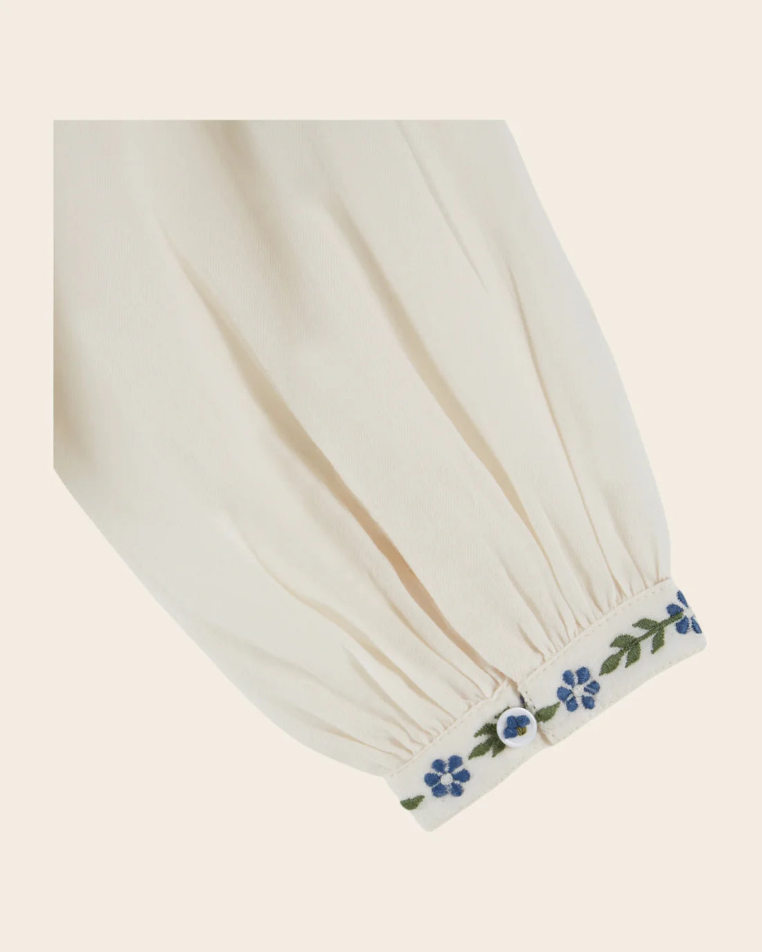 A flowing cream cotton blouse inspired by 1970s India. Hand-smocked by artisans, it features pink and khaki embroidery, mother-of-pearl buttons, and delicately buttoned cuffs.