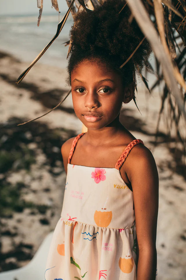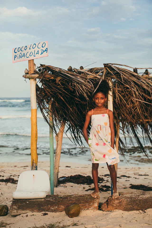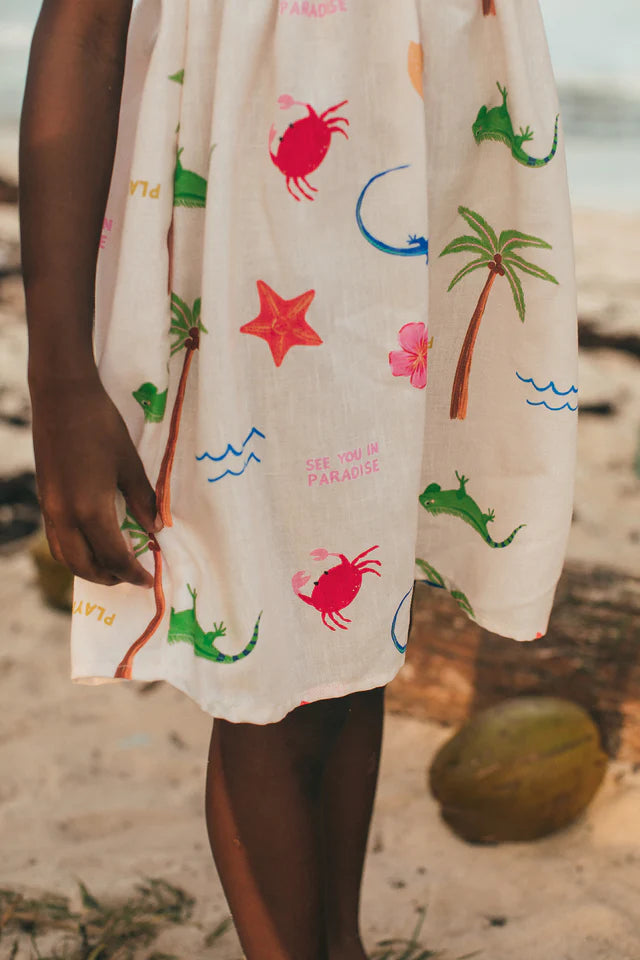 The Isleño Dress – SAI Arena is a lightweight girls tropical summer dress featuring a playful island-inspired print with palm trees, sea creatures, and sunny beach motifs.