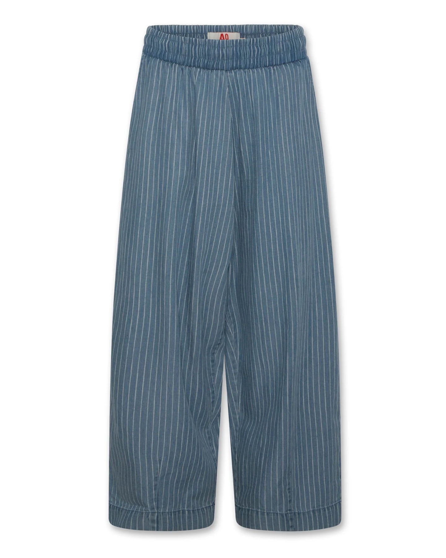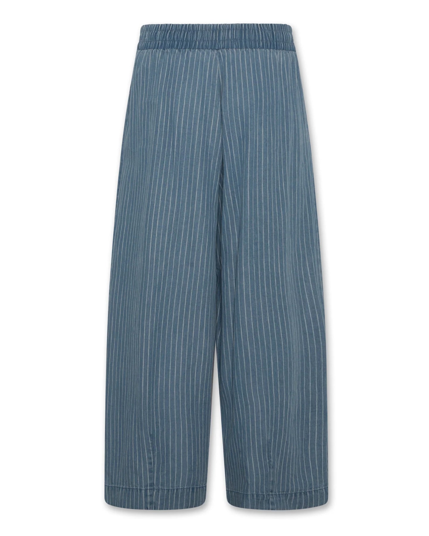 The pants combine effortless comfort with a modern silhouette. Designed in a soft blue wash with subtle vertical pinstripes, these wide-leg pants create a relaxed yet stylish look for everyday wear.