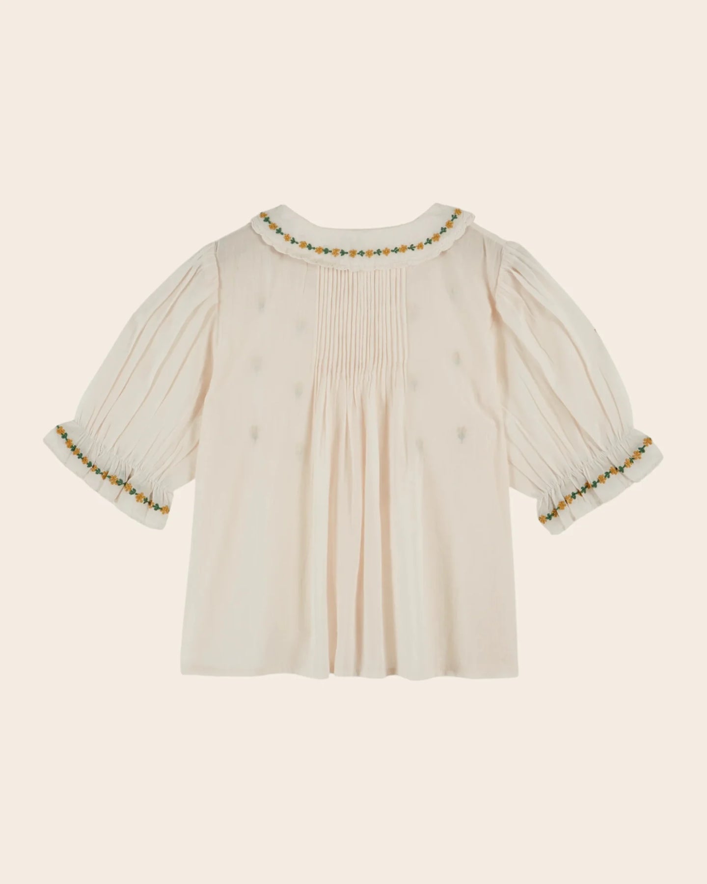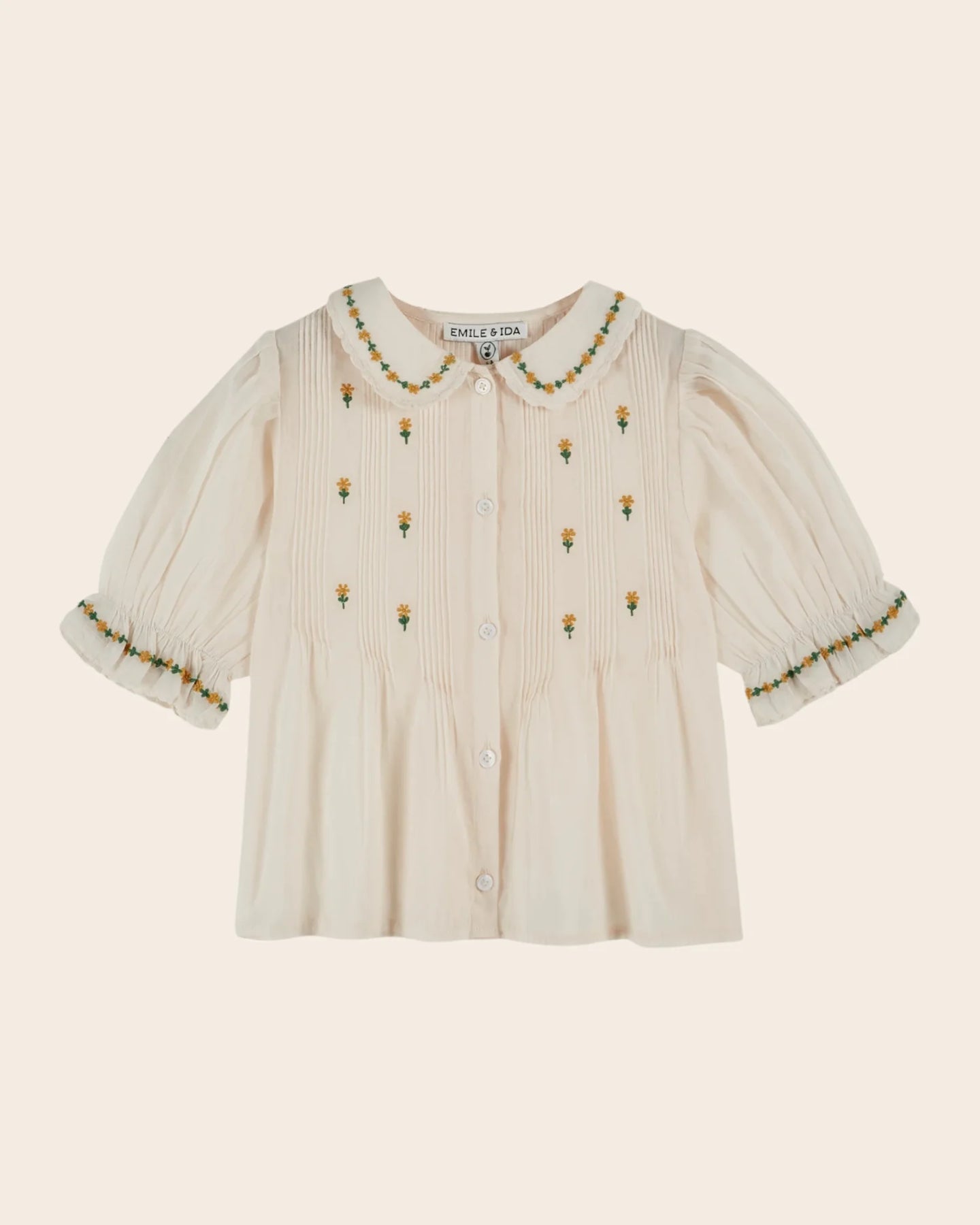 The Émile et Ida Embroidered Cream Blouse is a beautifully timeless piece crafted in soft, lightweight cotton voile. Featuring delicate hand-style floral embroidery scattered across the bodice and a sweet embroidered Peter Pan collar, this blouse blends vintage charm with everyday comfort. Pintuck pleats add refined detail, while gently puffed sleeves create a soft, romantic silhouette. Perfect for special occasions, family gatherings, and effortless everyday elegance.