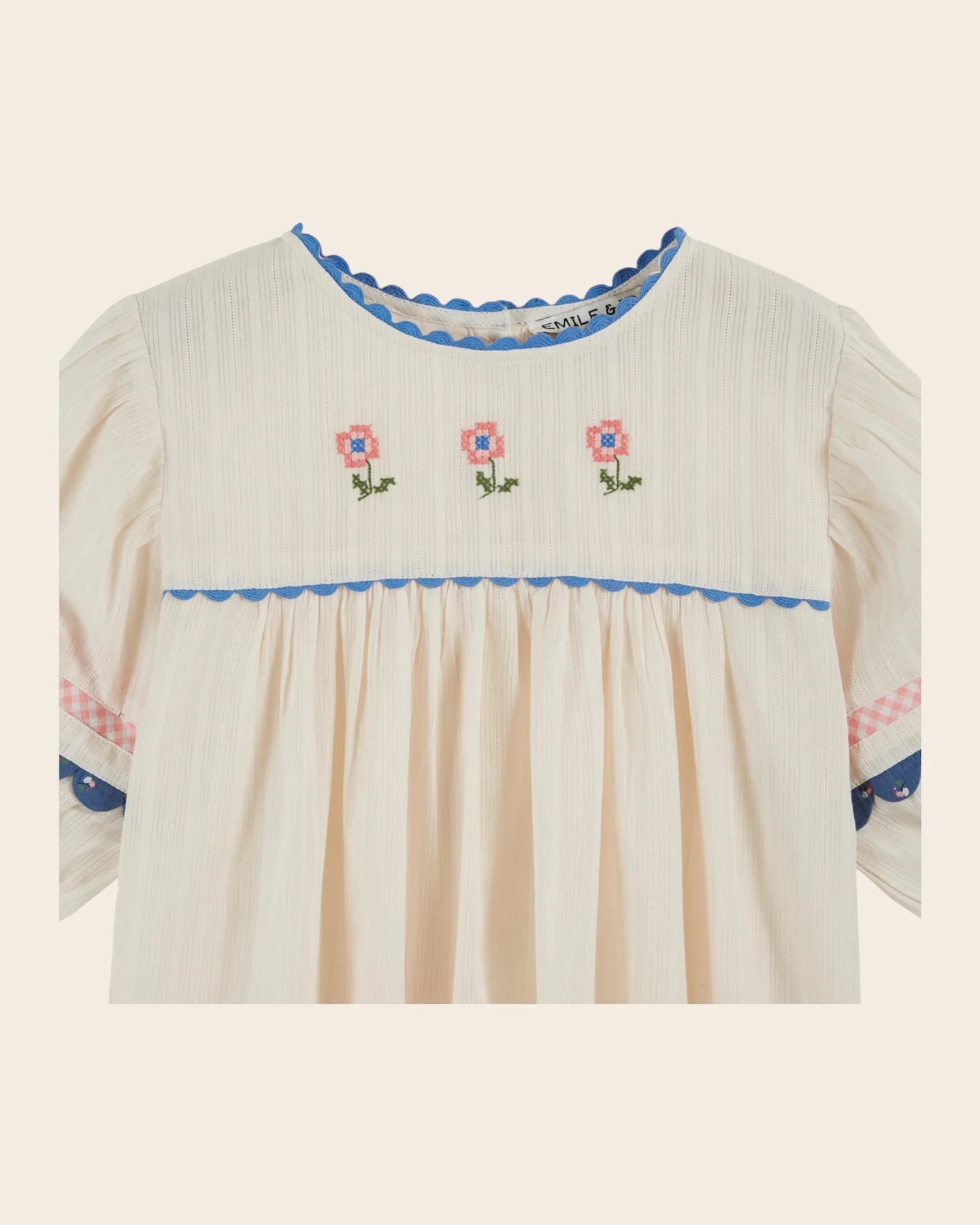 This girls embroidered cotton blouse from Émile et Ida blends delicate craftsmanship with playful detail. Made from lightweight cotton, it features hand-style floral embroidery across the chest, scalloped blue trim along the yoke and sleeves, and softly gathered puff sleeves for an airy silhouette. The soft cream base is finished with gingham accents and tiny embroidered florals, making it perfect for warm days, holidays, and special occasions alike.