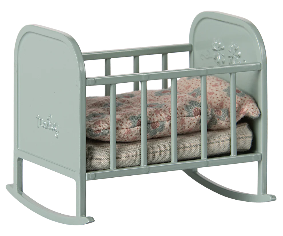 A beautifully designed cradle in metal with a soft sleeping bag and mattress inside. The cradle has a small flower embossment on the headboard and rounded legs so you can rock the little ones to sleep.