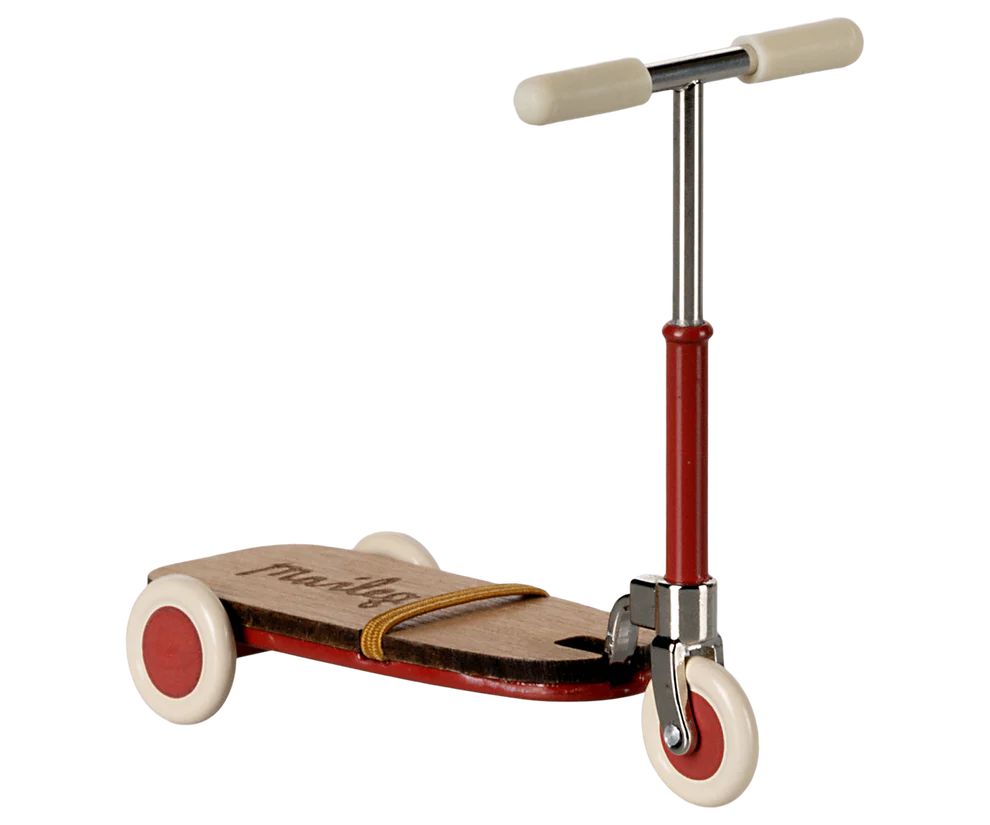 A kickboard with wooden details. The kickboard has a metal stick in the handlebars that makes sure mice with magnets in hands can stay on the board. A small elastic is added on the board and will secure the feet on the board during the ride.
