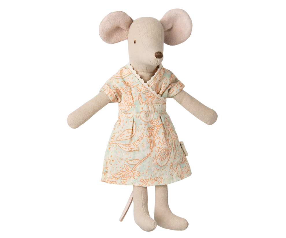 A classic Maileg item; Mum mouse in a light dress. This mouse fits furniture and accessories in size mouse. Buy more clothes separately. Clothes in size mum/dad fits this mouse.