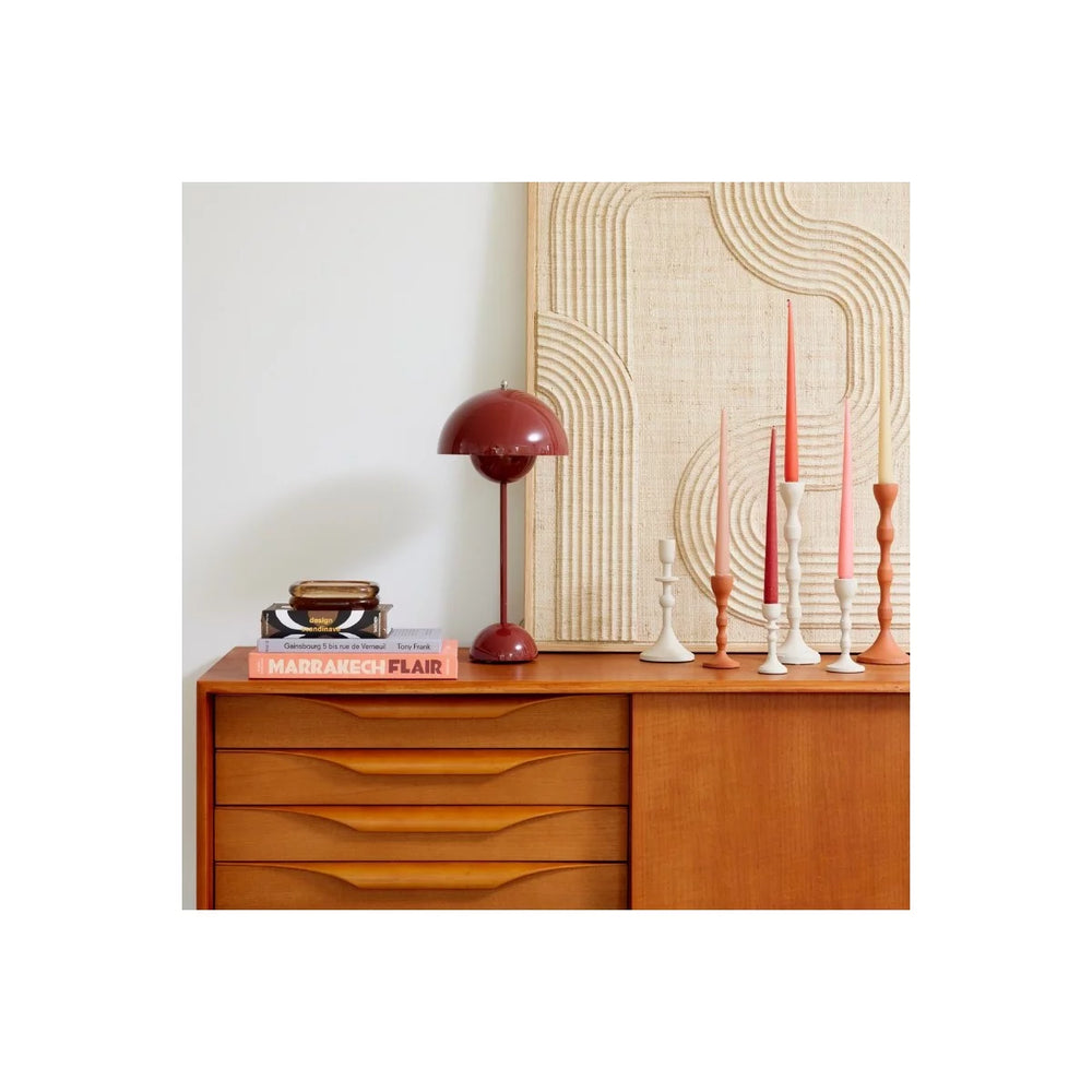 Multicolored metal candle holders. The charming Solar candle holders combine a simple shape with a bold, fashion-inspired color palette. They can be displayed alone or mixed with other pieces from the collection, playing with vibrant tones and varied heights for a dynamic and stylish effect.