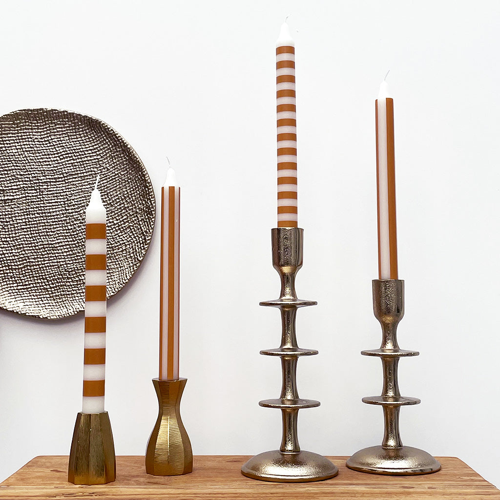 A sculptural gold candlestick holder designed to add warmth and elegance to any setting. Its textured finish reflects candlelight beautifully, creating a soft and refined glow. Perfect for dining tables, shelves or layered decorative displays.