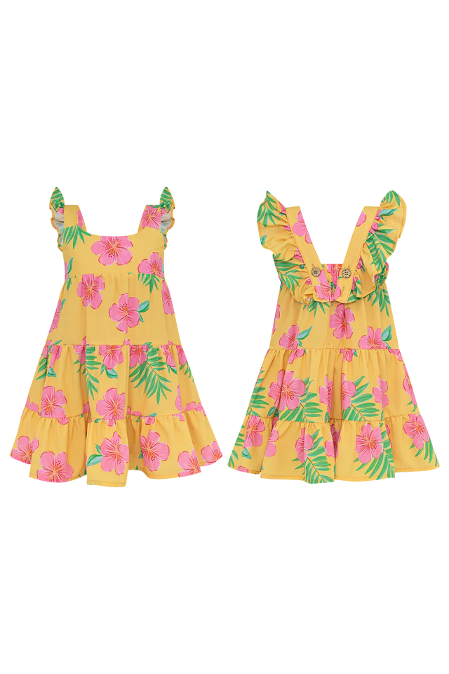 The Hibiscus Amarillo Corissia Dress features a vibrant yellow base with bold pink hibiscus flowers for a fresh tropical look. Designed with ruffled straps and a tiered skirt, this lightweight girls’ summer dress is perfect for beach holidays, sunny celebrations, and warm-weather days.