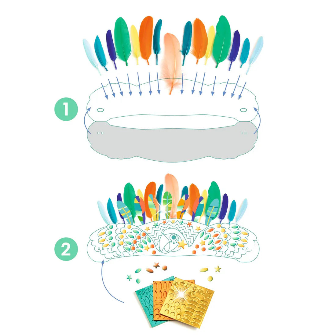 A creative kit to make a tropical headdress by decorating it with colourful feathers and stickers. Open up the textile headdress to reveal a self-adhesive area where you can arrange the colourful feathers.