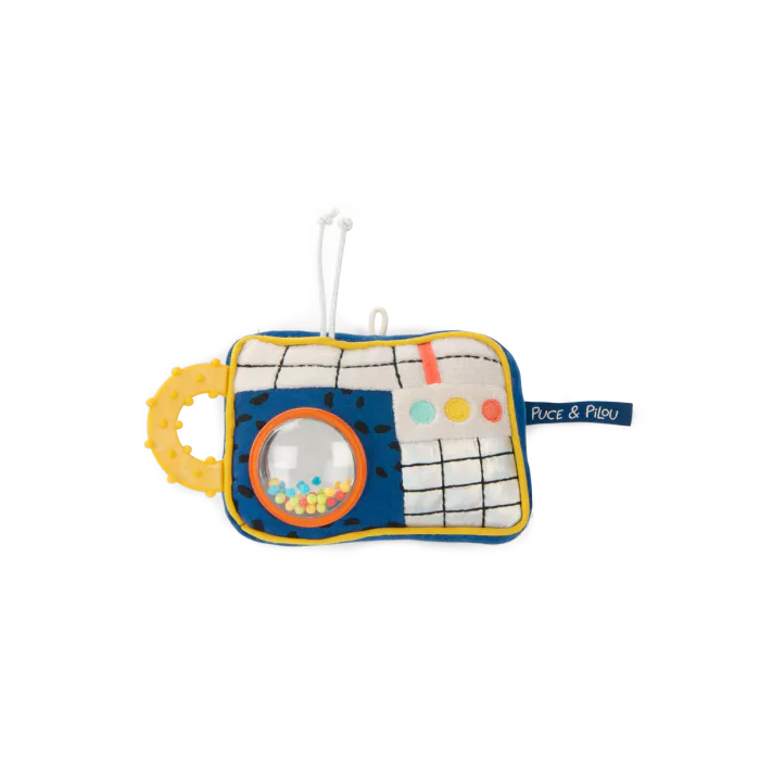 This is a colorful activity mini radio toy from Moulin Roty's Puce & Pilou collection. Designed for babies, it features soft fabric textures, a transparent rattle window with multicolored beads, and a teething ring handle. With its retro radio look and playful details, it's perfect for sensory exploration and on-the-go fun!