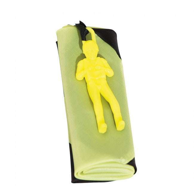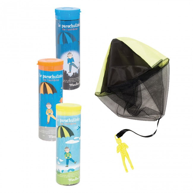 Parachutists to launch up in the air. The parachute fills with air and floats gently down to the ground. Each parachutist matches his own parachute, each with their own colour and their own world!