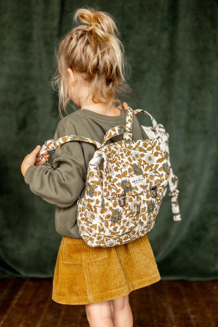 Suji, the perfect backpack for our minis. Exclusive fabric and artisanal block-print technique. Doubled inside tissue and adjustable metal fasteners.