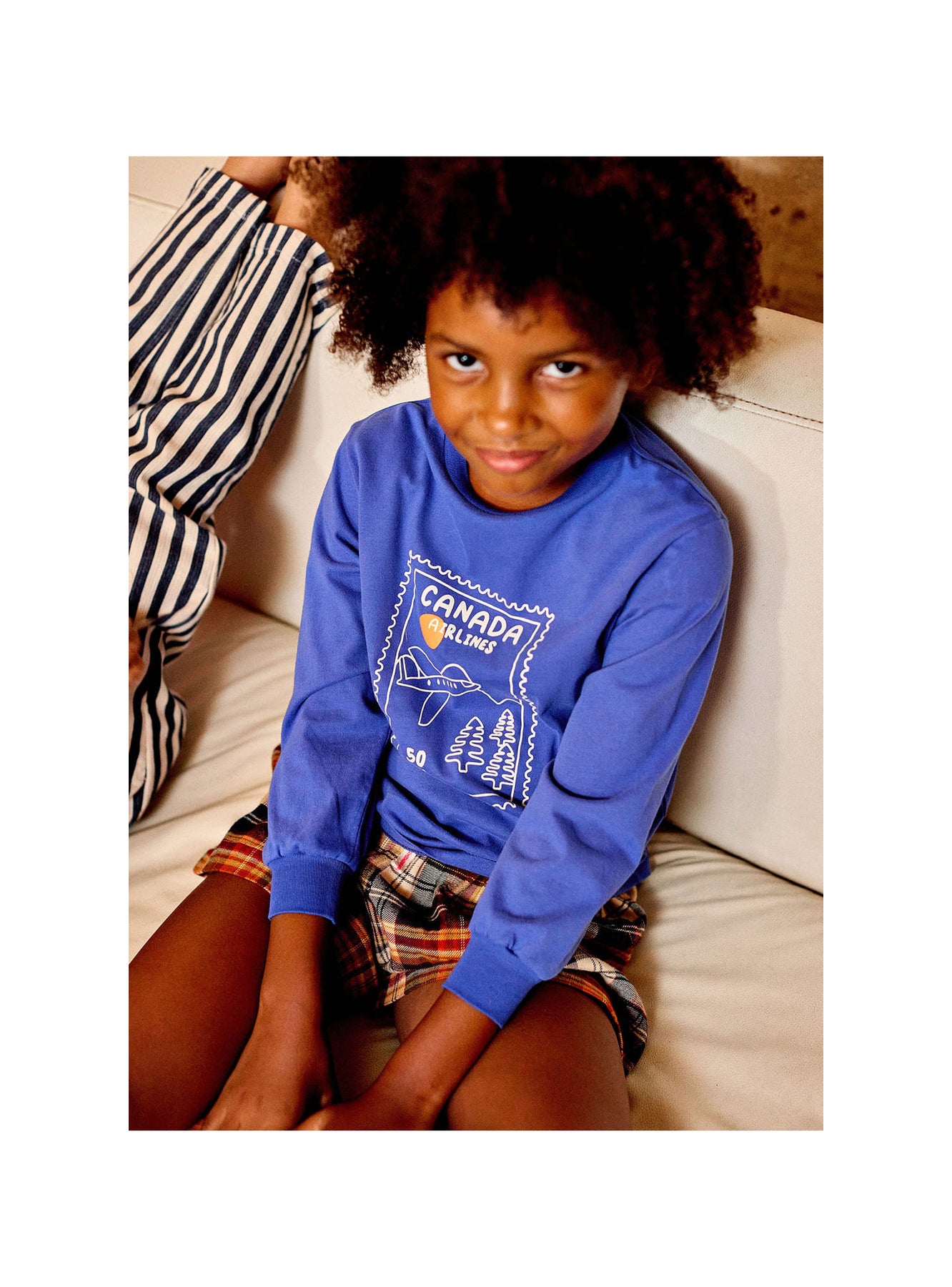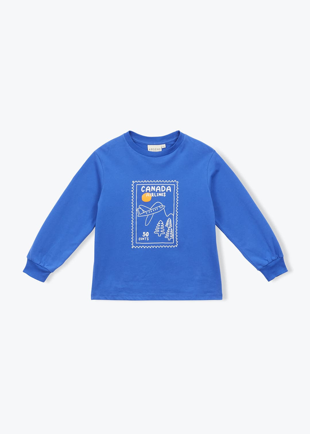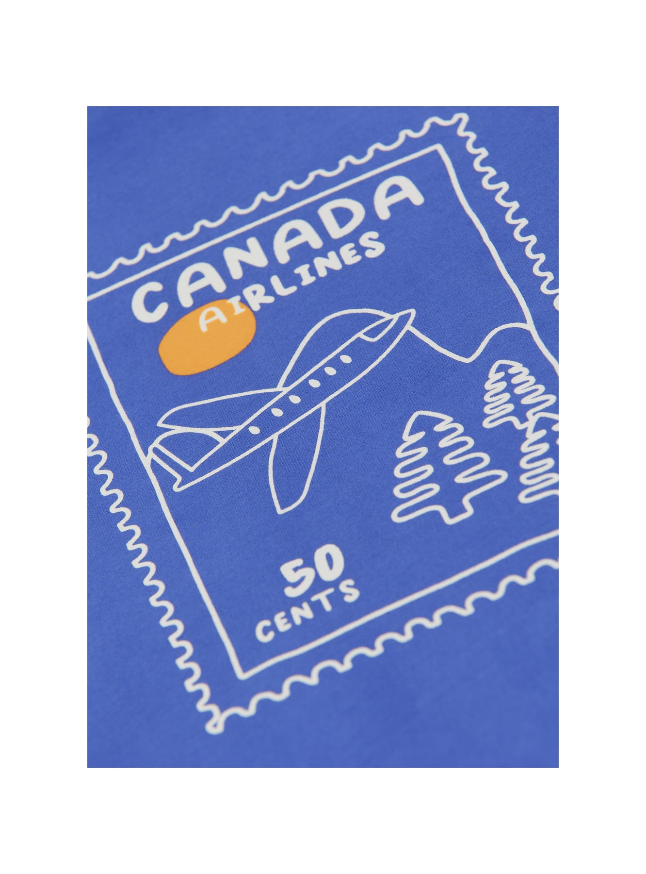 Made from soft organic cotton in a bright blue shade, it features a fun “Canada Airlines” print inspired by vintage travel stamps — perfect for kids who love planes and faraway destinations.
