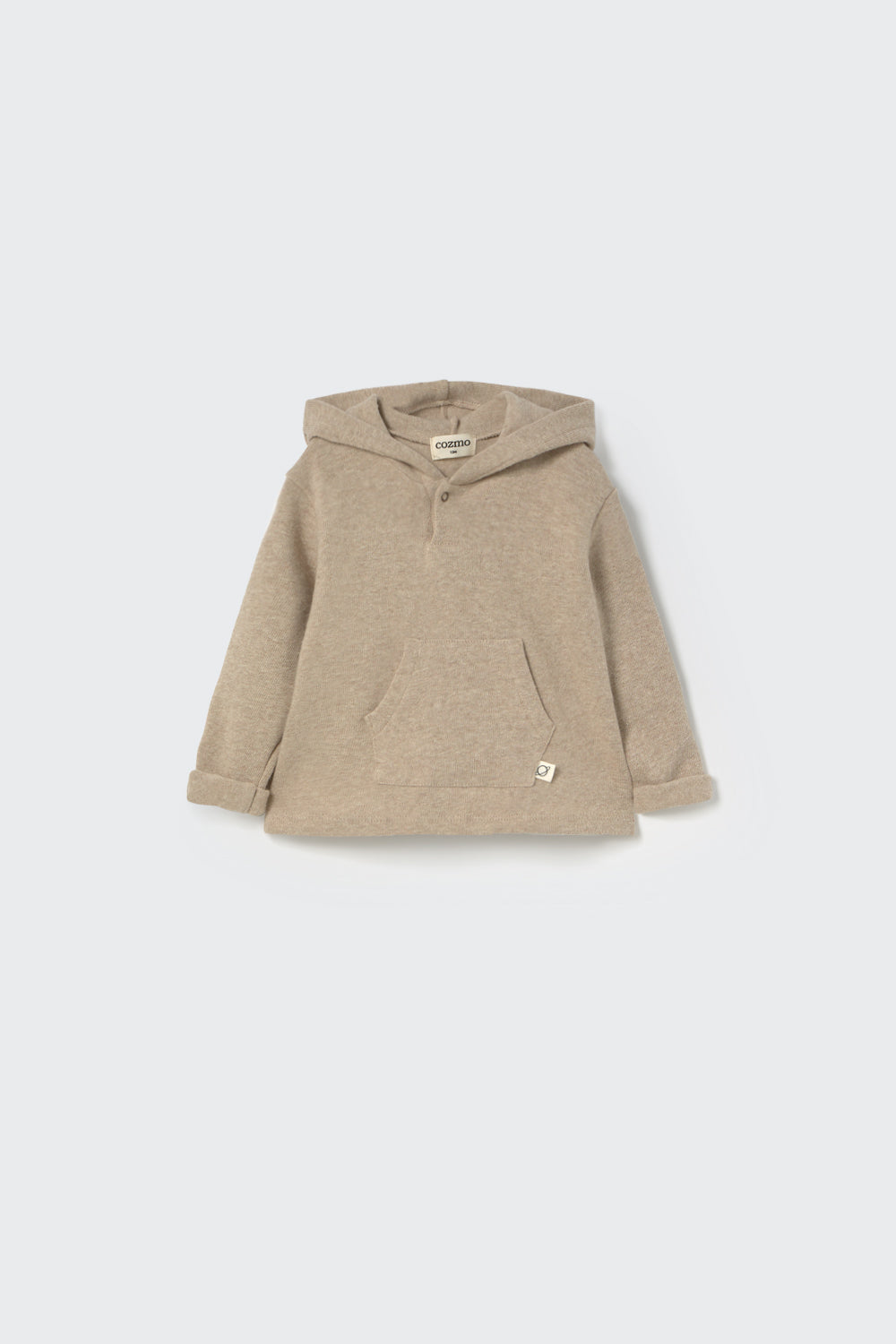 This baby sweater is crafted from soft, buttery-knit fabric, brushed inside and out for cozy warmth. It features a hood with a snap button closure at the neck, long sleeves with rolled cuffs, a front kangaroo pocket, and side slits for easy movement. A practical and comfortable layer, perfect for keeping little ones warm on cooler days.