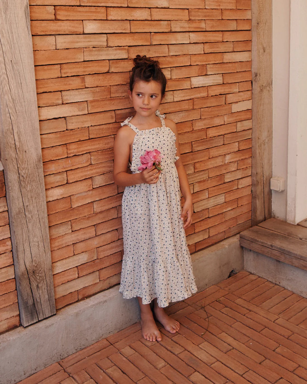 Long strapless dress in off-white cotton voile with delicate blue flower motifs set off by a pattern of small red dots. The bodice of this dress resembles the bibs of overalls held in place by shoulder straps. The gathers of the skirt are supported by the bibs and give the skirt fullness, finished with a large and then a small flounce. Almost like overalls, the sides are fastened with knots instead of buttons. A dress that doesn't wait for the right occasion to be worn!