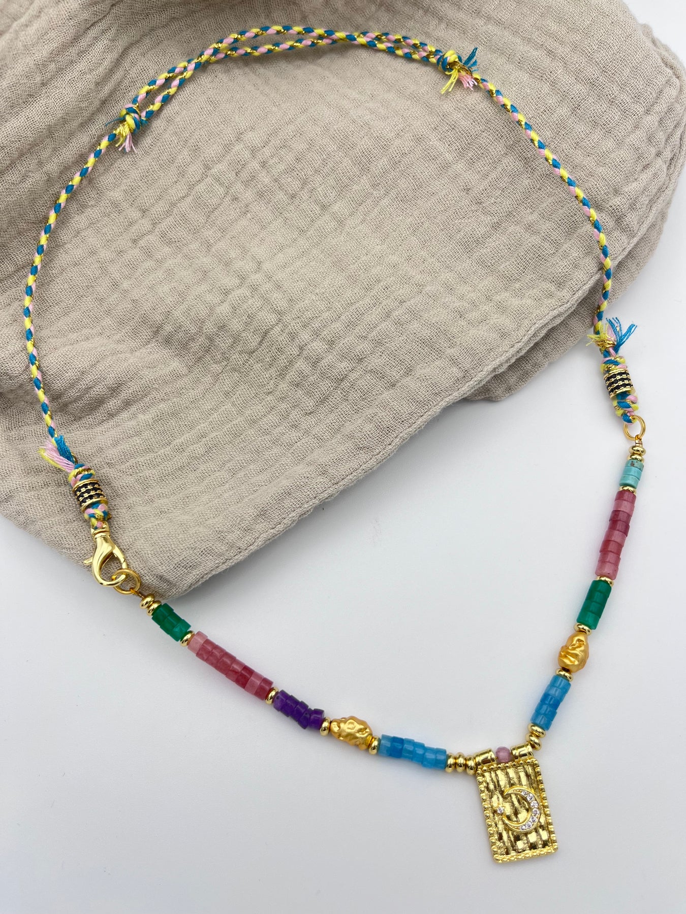 Colorful necklace with beaded cord and gold card pendant. Choose your symbol: eye, heart, or moon for a touch of meaning and style.