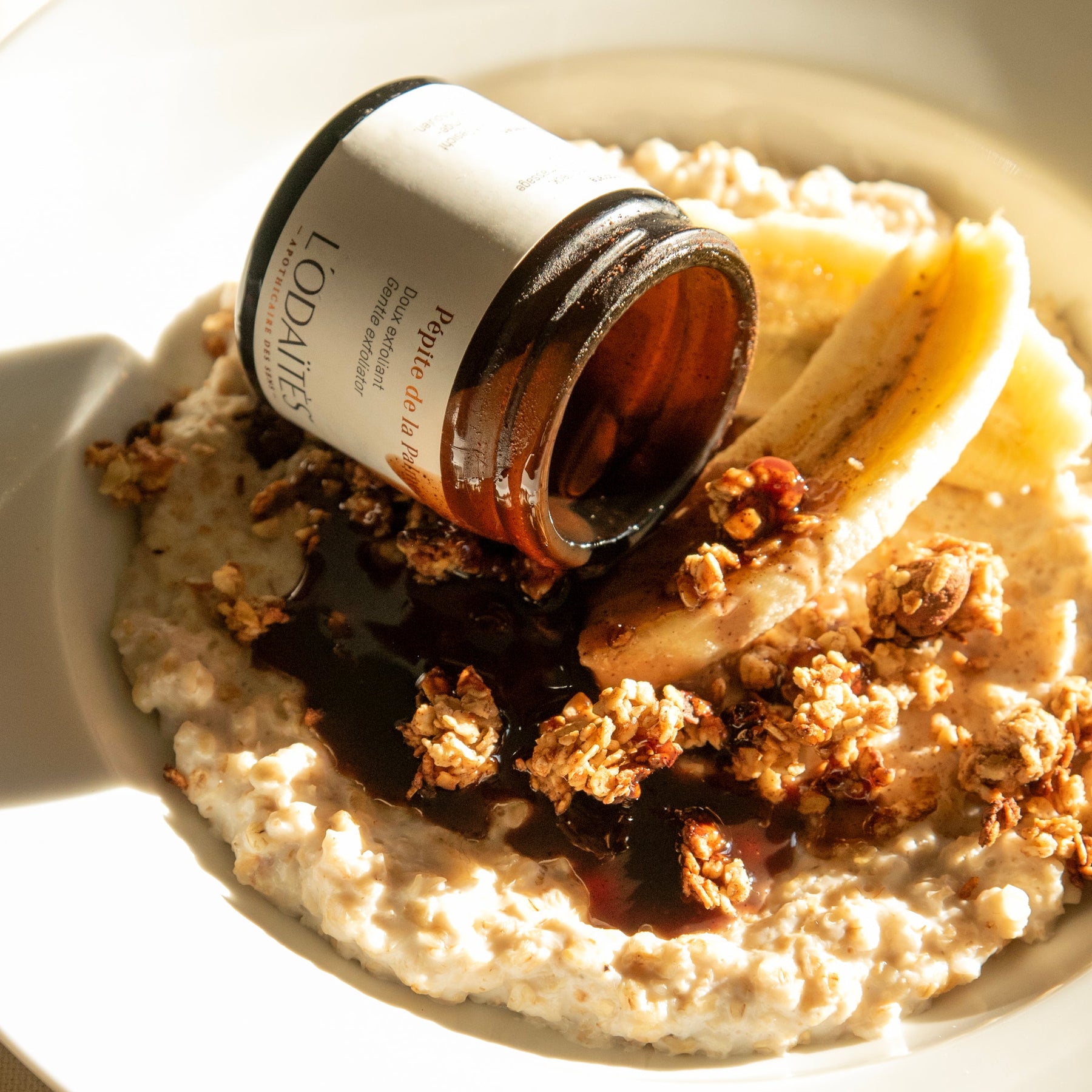 This gentle exfoliator enhances the virtues of date seed and olive leaf powders, ultra-fine and powerfully antioxidant. Their combination with Aloe Vera and honey, with their moisturizing and soothing powers, gives this sensory, gourmet composition a gentle dual action. Invigorated and energized, your skin appears smooth, clear and radiant, with a refined texture.
